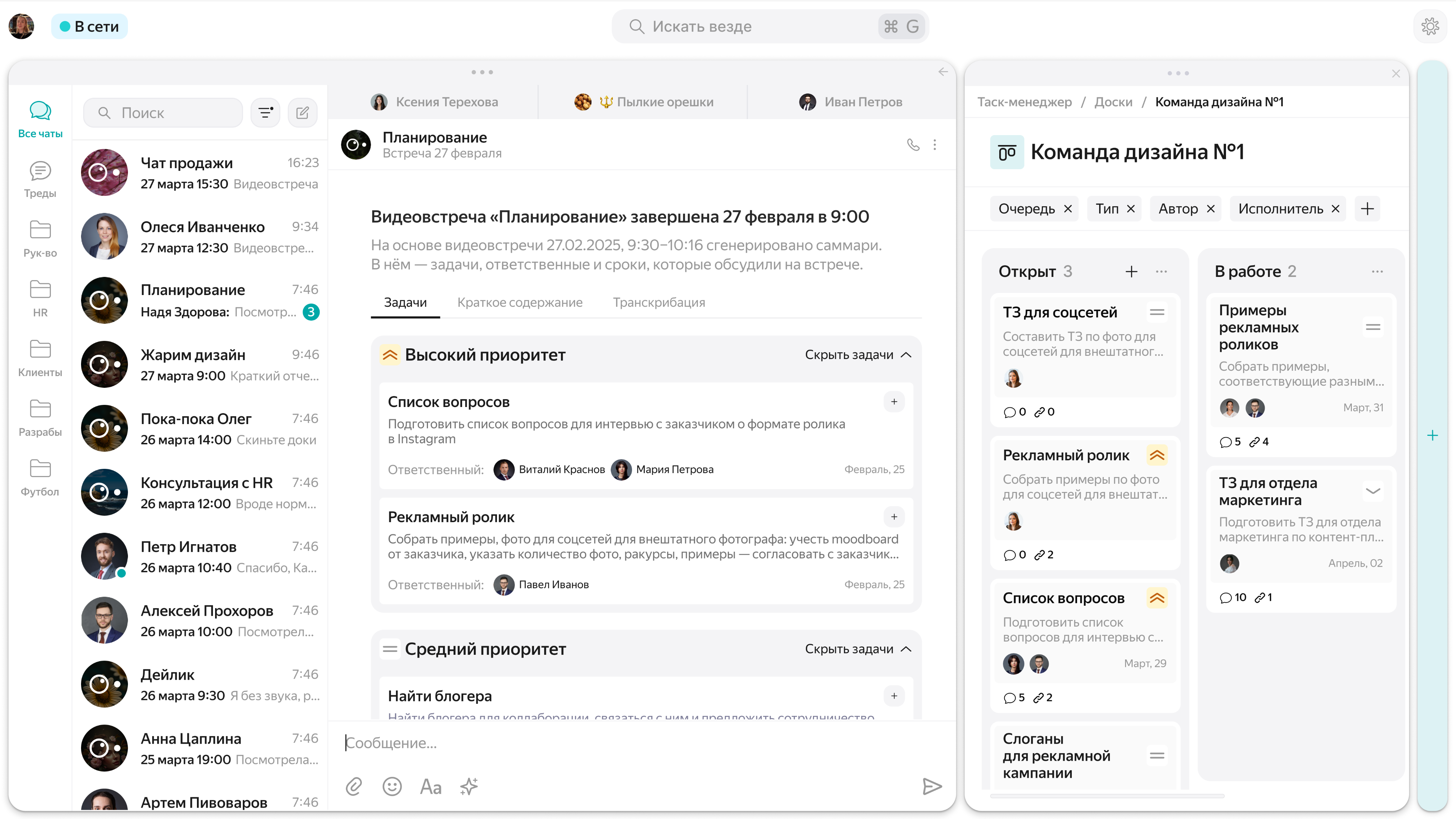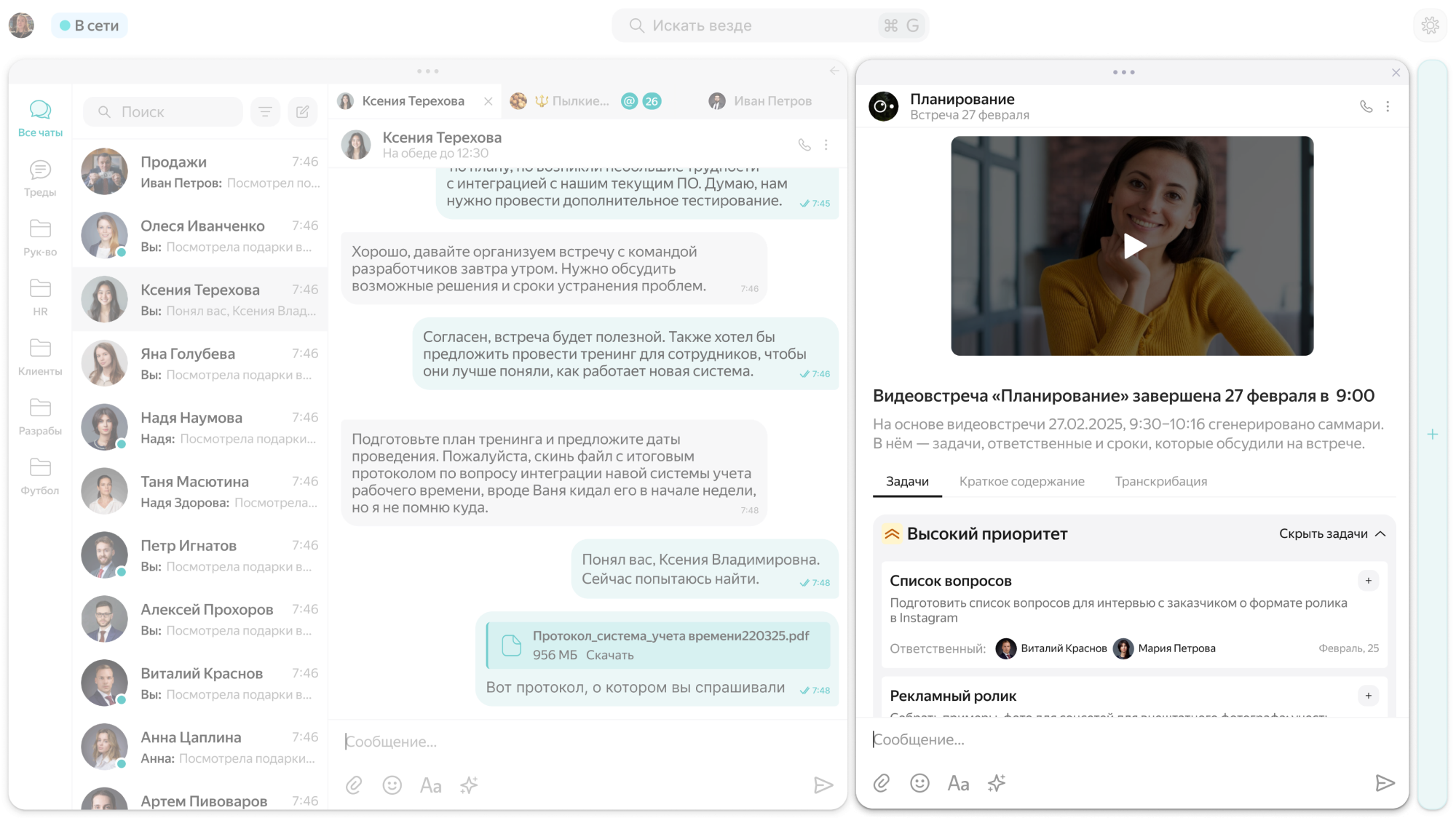 Решение: «Архив». А ещё, можно настроить автоматическую архивацию неактивных чатов — как в Яндекс.Почте. А все чаты, созданные после встреч – добавляем в отдельное, открываемое фильтрацией. После фильтрации, будут показаны чаты из телемоста, с видеозаписью конференции, задачами, кратким содержанием и транскрибацией.